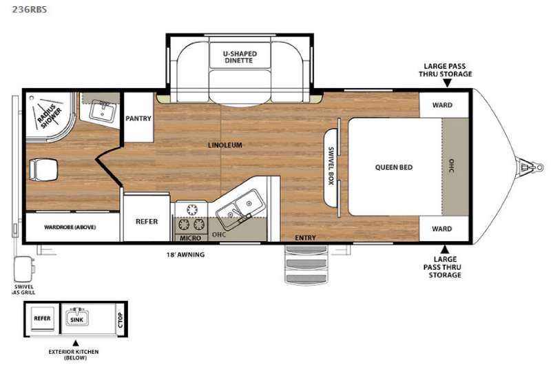The Vibe Extreme Lite 236RBS travel trailer by Forest River has everything you need for your next camping trip. From the single u-dinette slide to all of the storage that is available, you won't be lacking in room.