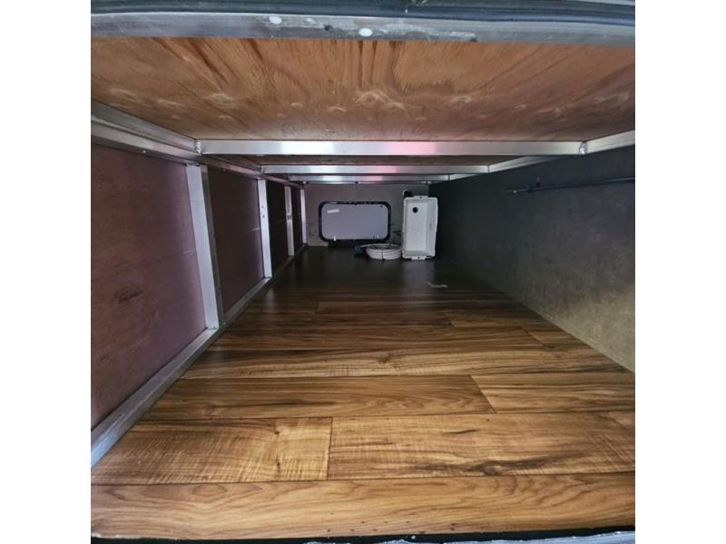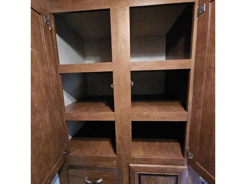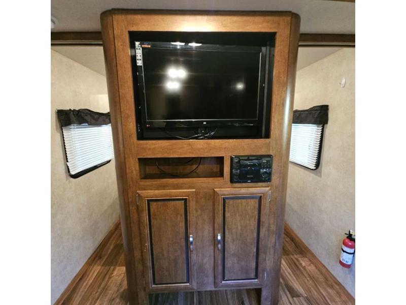 The main living area has an entertainment center which can easily be seen from anywhere in the kitchen area. Along one side of the trailer there is a double kitchen sink, three burner range, microwave, and refrigerator. On the opposite side of the trailer you will find a u-dinette slide. Adjacent to the slide there is a wardrobe and large pantry.