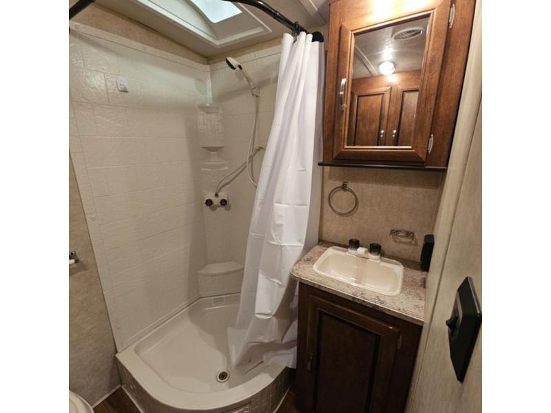 In the rear of the trailer you will find the bathroom. It is quite spacious and has a sink, medicine cabinet, radius shower, toilet, and large wardrobe.