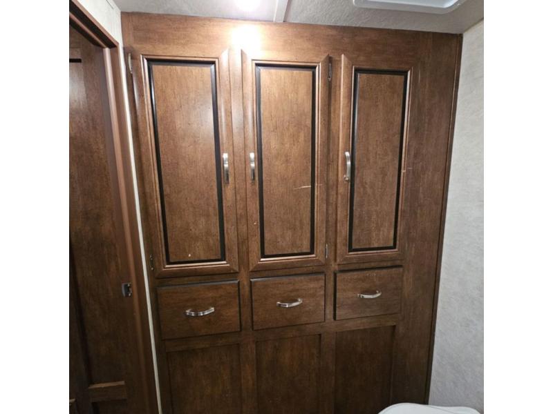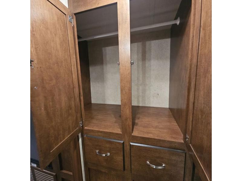 As you enter the travel trailer, to the right you will find the front bedroom. There is a queen bed with wardrobes on either side of the bed.