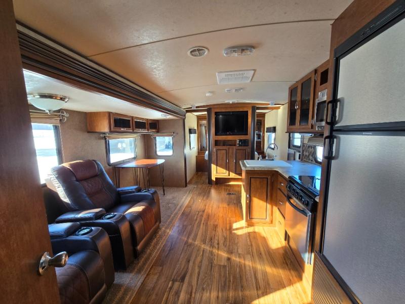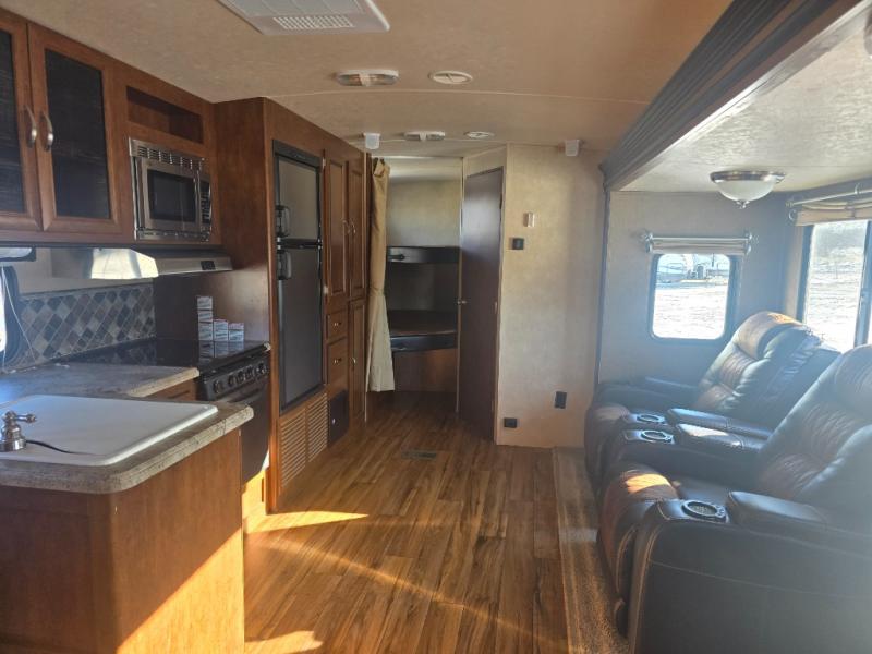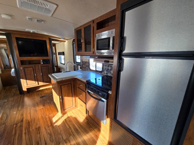 As you enter the travel trailer, to the left there is a double kitchen sink, three burner range, microwave, refrigerator, pantry, and wardrobe. On the opposite side of the trailer you will find a slide with a u-dinette and a jiffy sofa. Along the front of the living area you will enjoy the entertainment center.