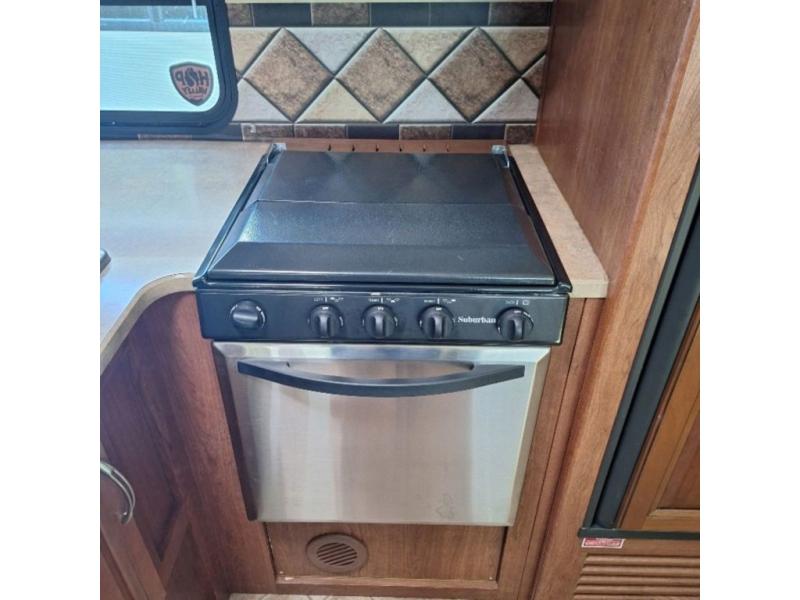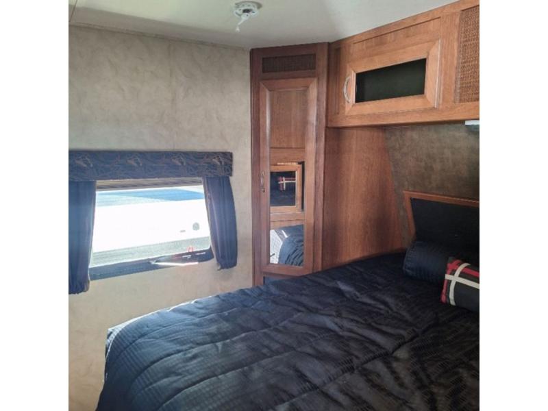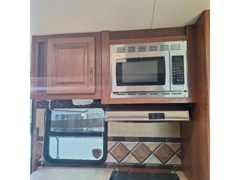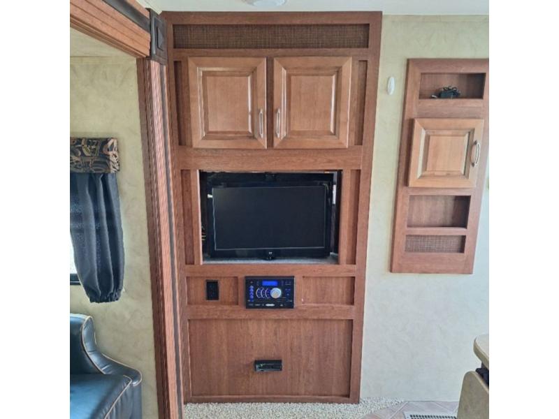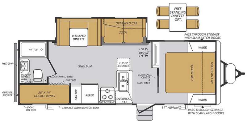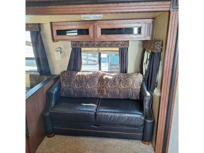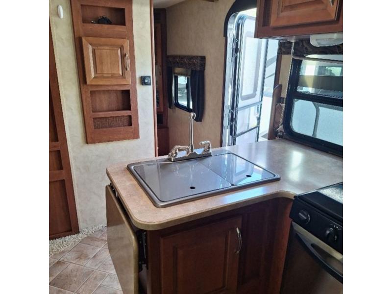 As you enter the fifth wheel, to the left there is a l-shaped counter with a flip-up counter, double kitchen sink, three burner range, microwave, refrigerator, and pantry. The opposite side of the trailer has a slide with a u-dinette or an optional free-standing dinette, and a sofa. Next to the slide you will find a swivel LCD TV/DVD AV system.