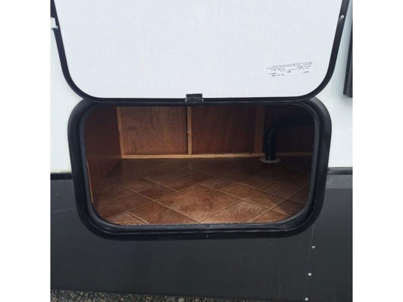 There are plenty of overhead cabinets throughout the trailer as well as an exterior pass through storage area.