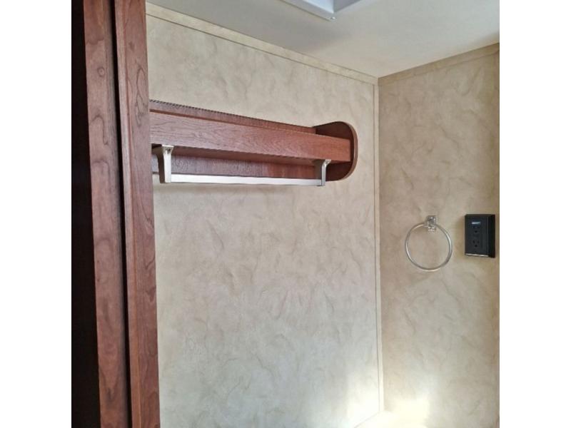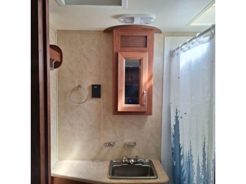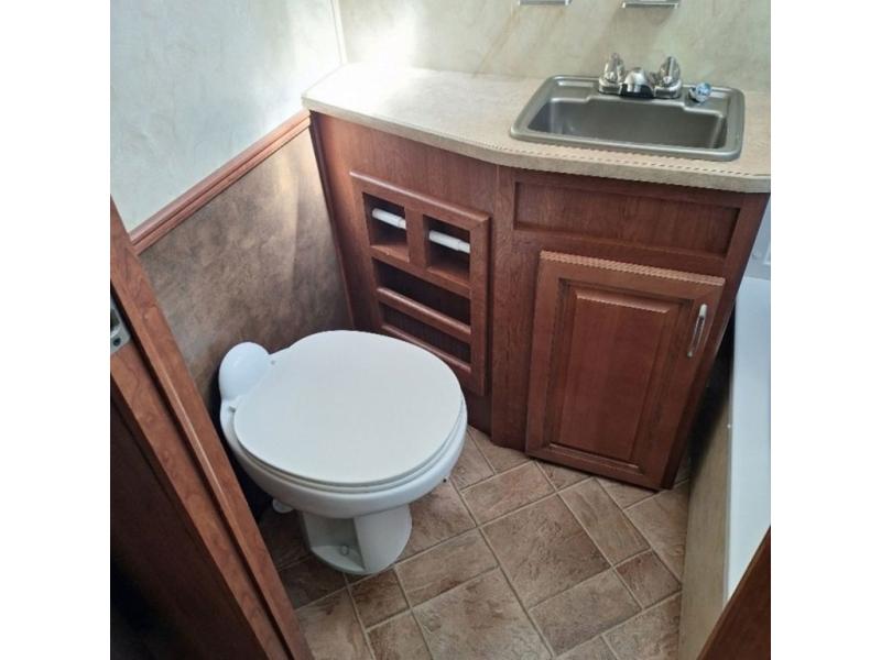 The bathroom is located in the rear of the trailer. In the bathroom you will find a tub, toilet, medicine cabinet, and toilet.