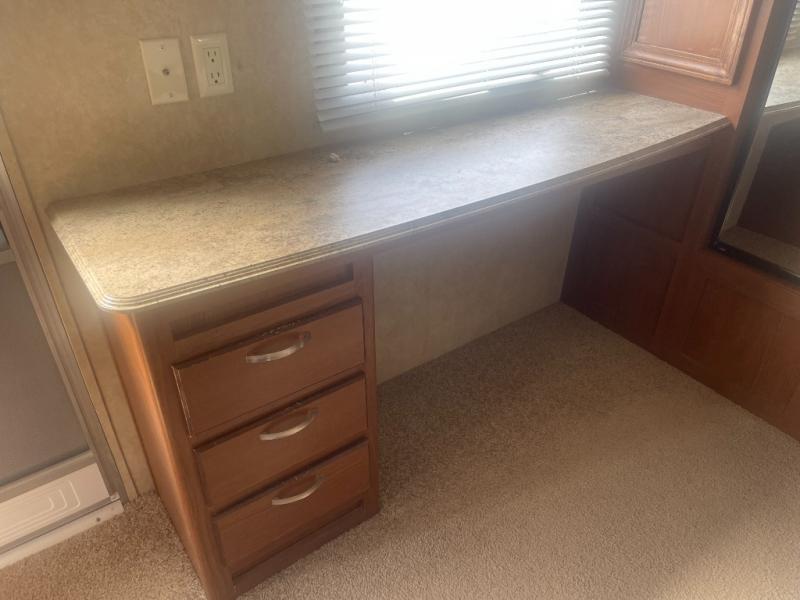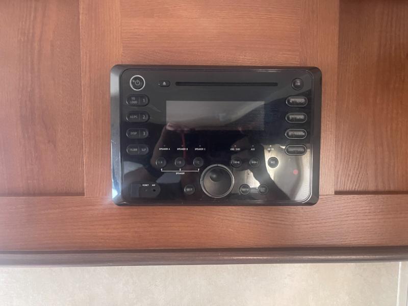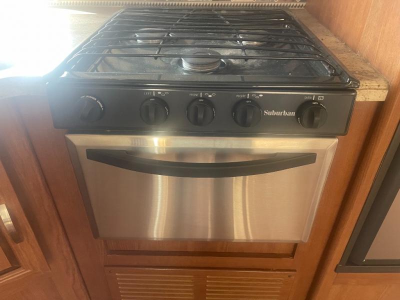 There are two entrances on this model, the front entrance will take you into the living and kitchen area. The rear entrance will lead you into the bedroom. Starting in the front of the model, to the right of the entrance is a lounge chair, pantry, refrigerator, three burner range, microwave, and kitchen sink. There is plenty of counter space which makes food preparation a breeze. Along the opposite side of the travel trailer is a slide with a sofa and dinette. You can relax in the lounge chair, at the sofa or dinette and enjoy the entertainment center.