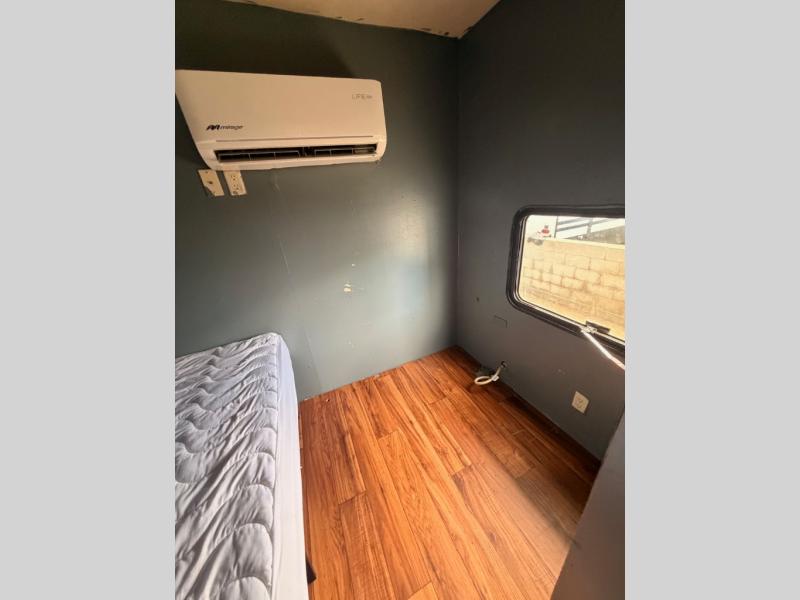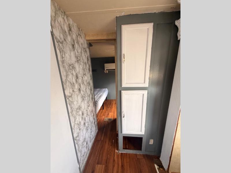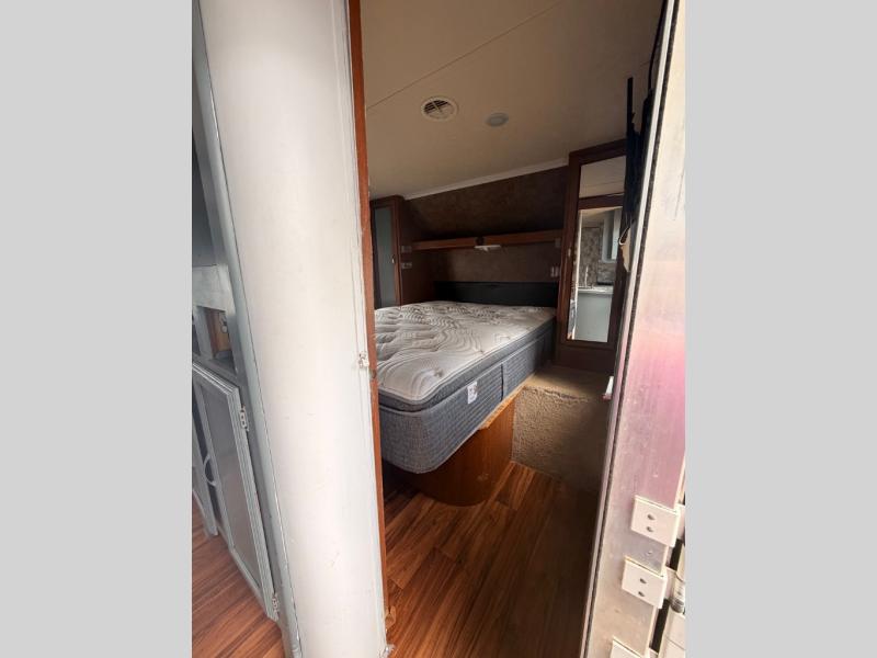 Stepping inside the trailer, to the right you will enter the front bedroom. There is a queen bed with wardrobes on either side of the bed.