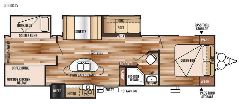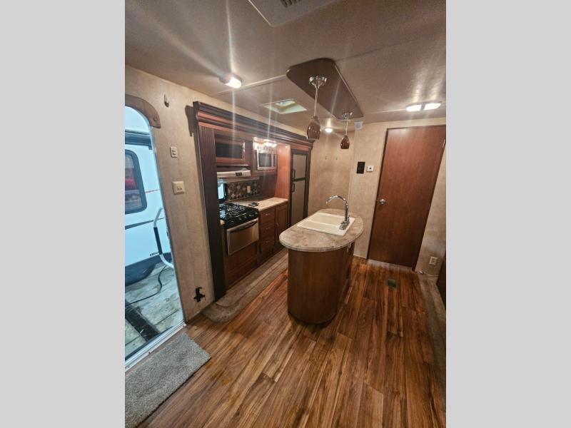 As you enter the travel trailer, to the left there is a slide with a three burner range, microwave, and refrigerator. To the right of the entrance you will find a nice size pantry. Just around the corner from the pantry there is an entertainment center. On the opposite side you will find a slide with a dinette and a sofa. The kitchen island offers extra counter space and a double kitchen sink as well as twin lazy Susan's which provide great storage.