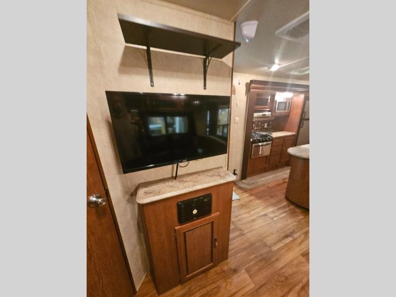 The rear bunk house has a slide with a set of bunk beds. Along the rear wall you will find a swing arm for a TV. There is an upper bunk on the opposite side of the trailer.