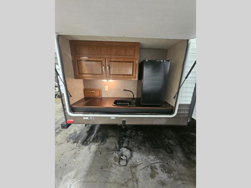 The rear bunk house has a slide with a set of bunk beds. Along the rear wall you will find a swing arm for a TV. There is an upper bunk on the opposite side of the trailer.