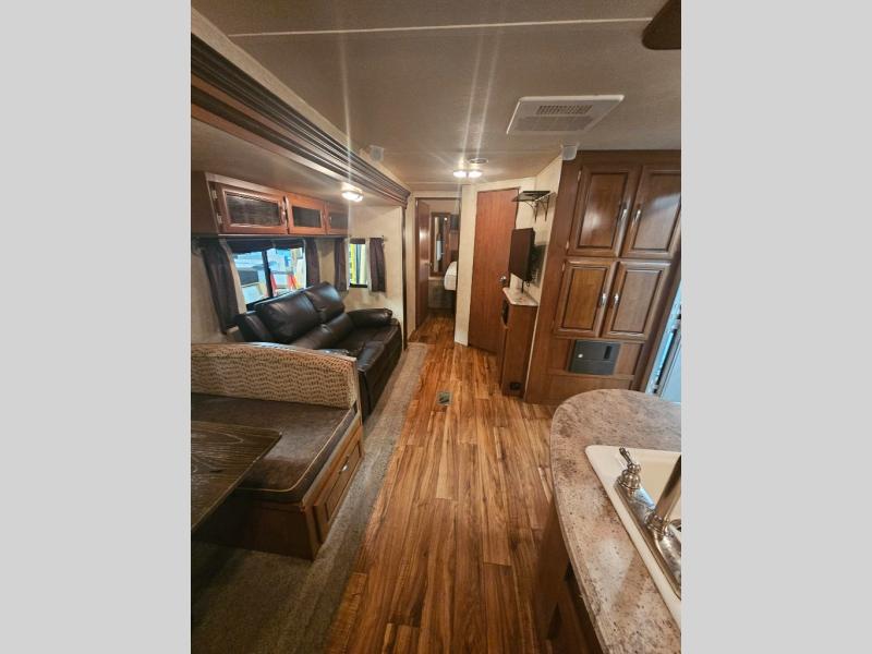 As you enter the travel trailer, to the left there is a slide with a three burner range, microwave, and refrigerator. To the right of the entrance you will find a nice size pantry. Just around the corner from the pantry there is an entertainment center. On the opposite side you will find a slide with a dinette and a sofa. The kitchen island offers extra counter space and a double kitchen sink as well as twin lazy Susan's which provide great storage.