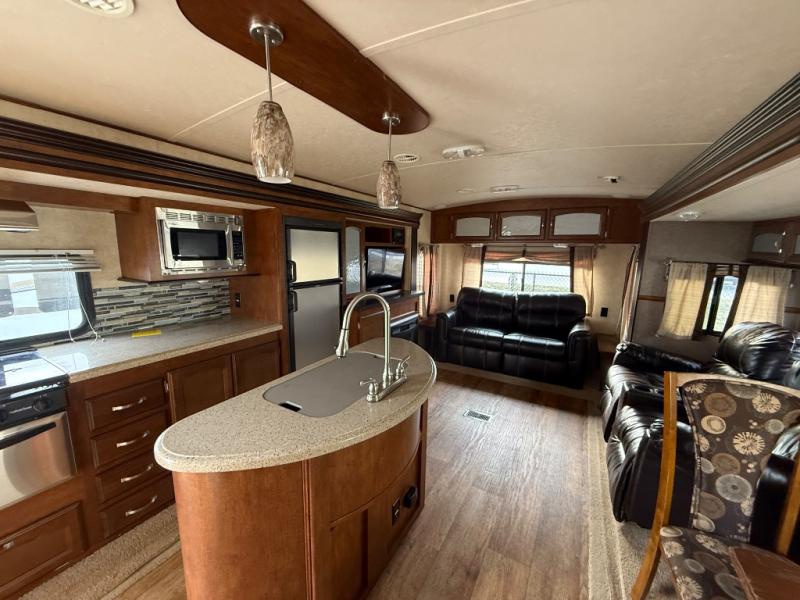 As you enter the travel trailer, to the left is a large slide with a three burner range, microwave, lots of counter space, pantry, refrigerator, and entertainment center. Along the rear wall is a tri-fold sofa. The other slide has theater seating and a dinette. You will also find a kitchen island with the double kitchen sink.