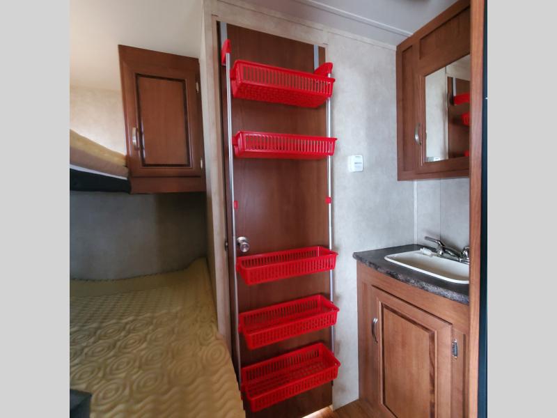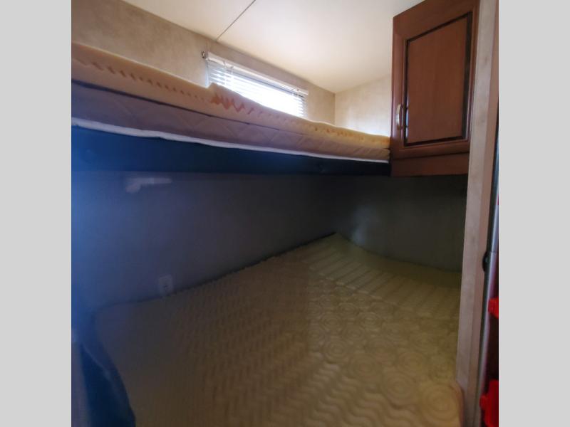 In the rear of the travel trailer you will find a double bed with a single bunk above and a wardrobe in the corner.