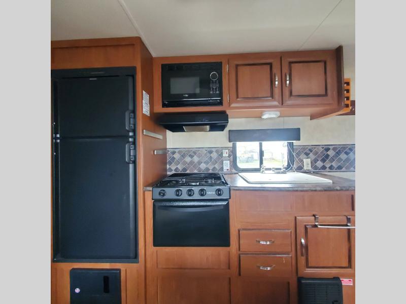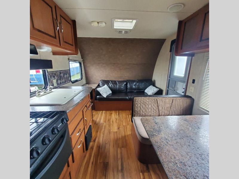 As you enter the travel trailer to the right is a sofa and end table. Along one wall you will find a double kitchen sink, three burner range, microwave, and refrigerator. The opposite side of the travel trailer has a dinette.
