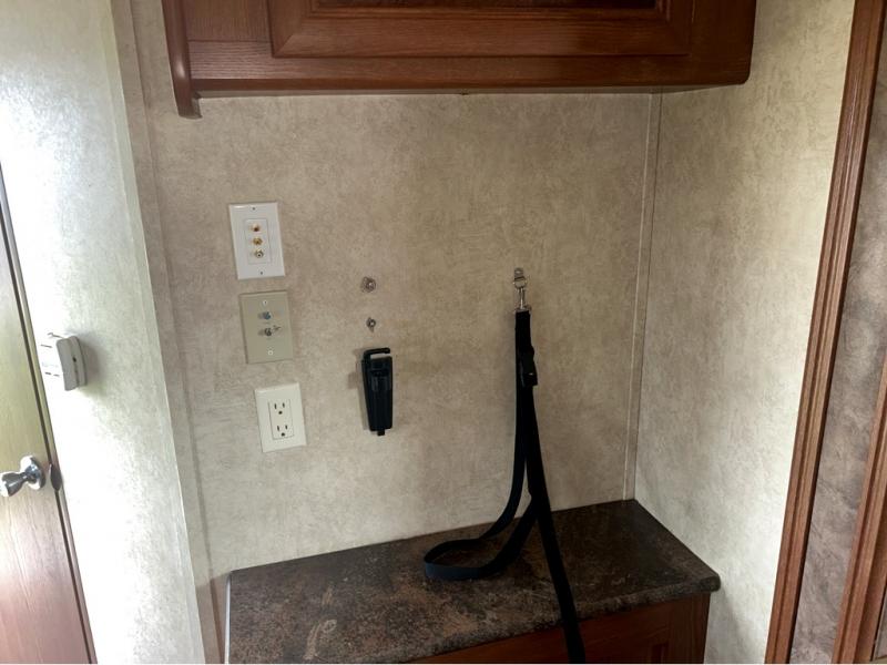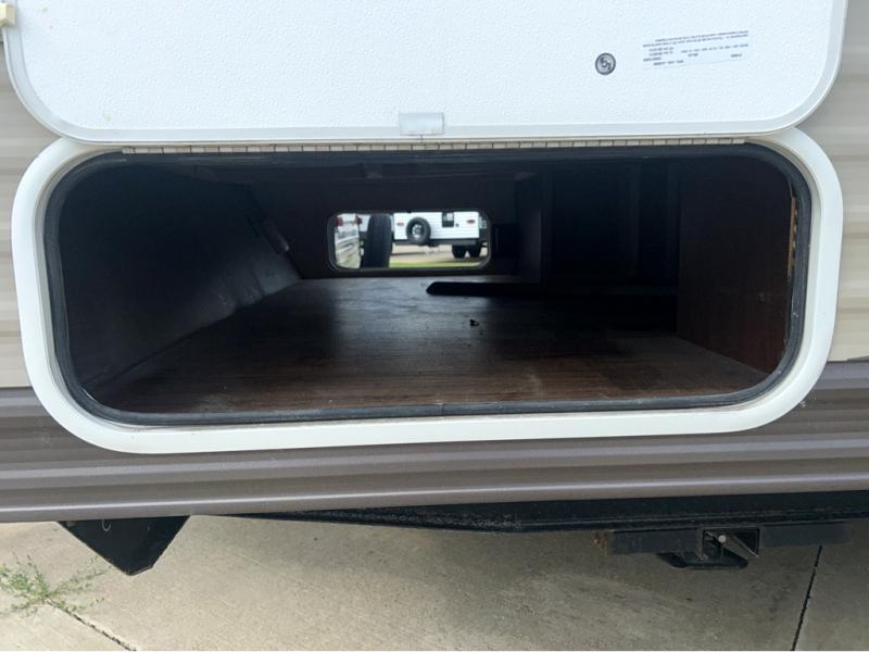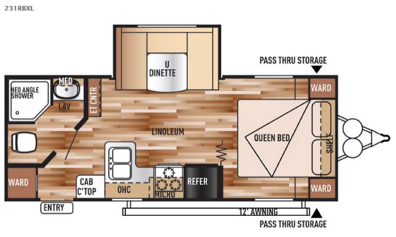 There are also plenty of overhead cabinets throughout the travel trailer as well as a front pass thru storage area.