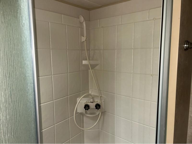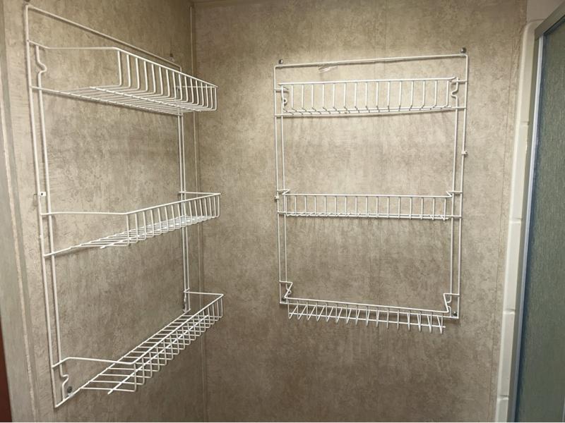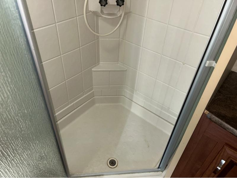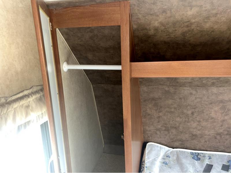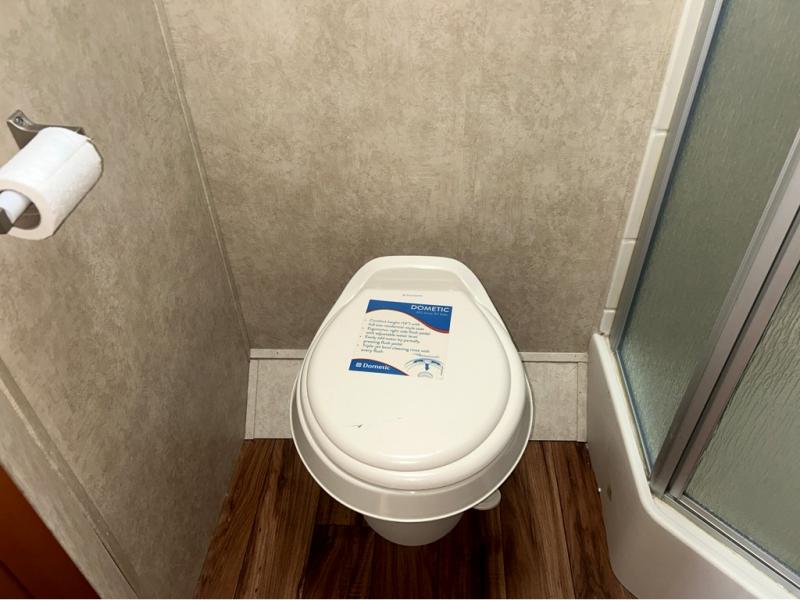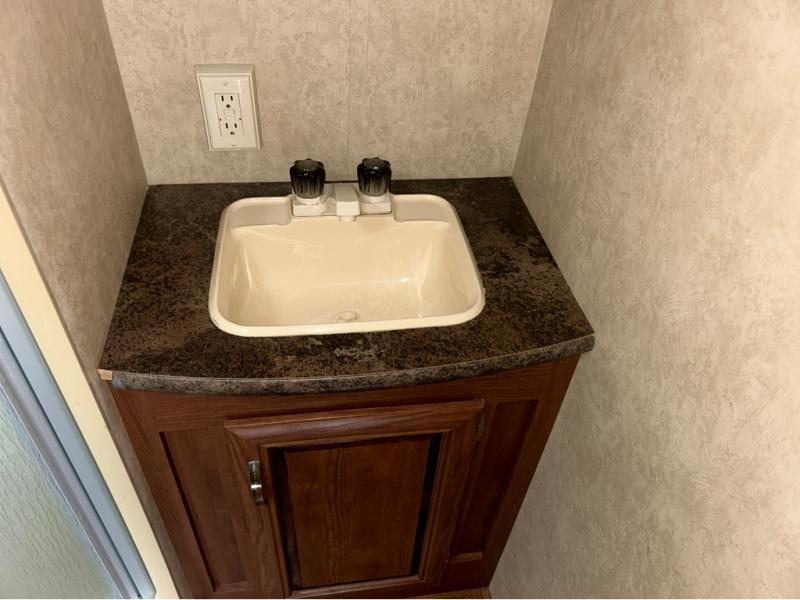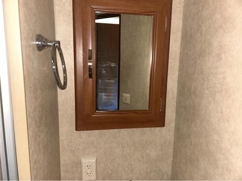 As you enter the travel trailer, to the left is a wardrobe. You will notice that the bathroom is in the rear. There is a toilet, neo-angle shower, sink, and medicine cabinet.