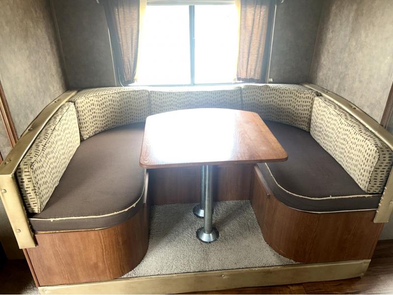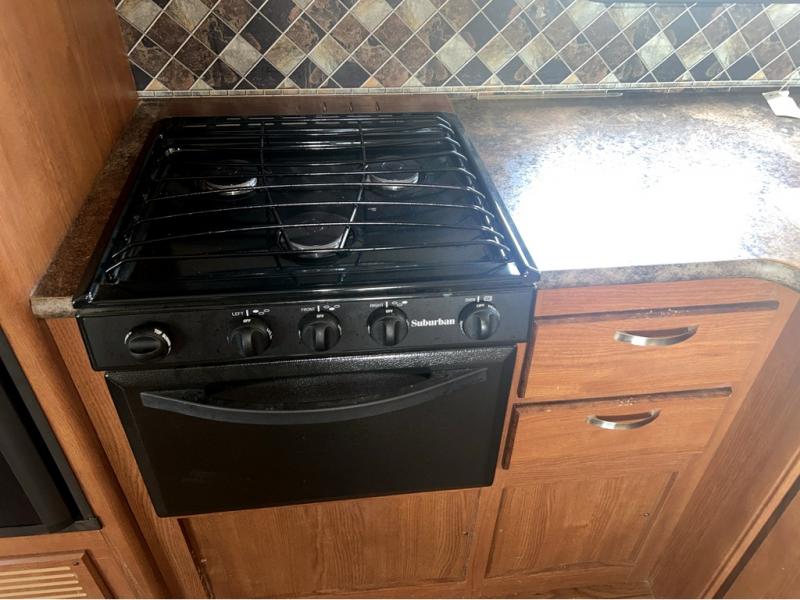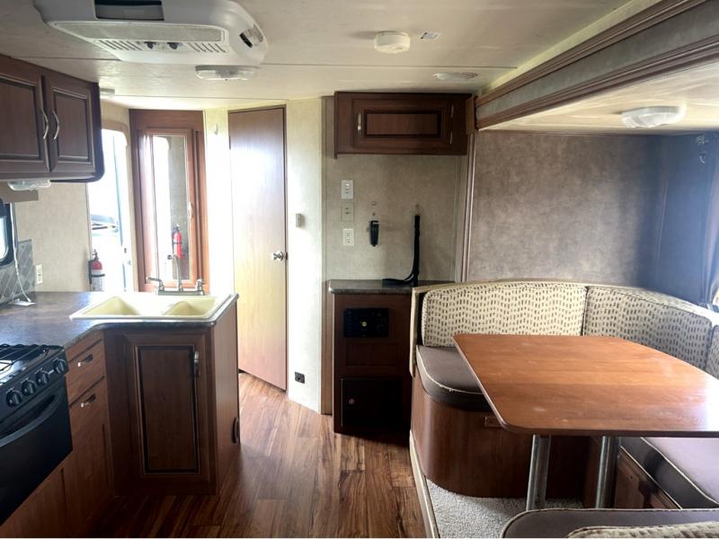 The main living area offers an entertainment center and a u-dinette slide on one side of the travel trailer. On the other side there is a double kitchen sink, three burner range, microwave, and refrigerator.