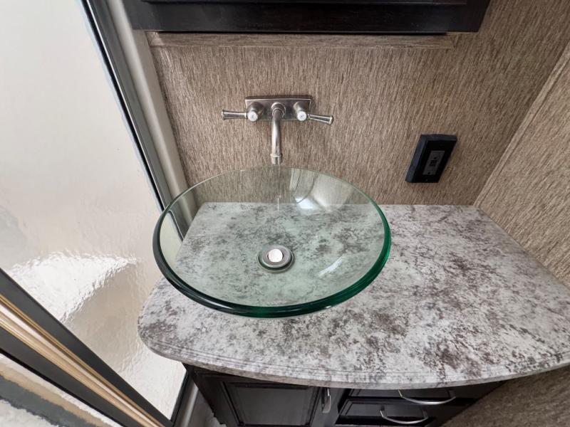 The combined kitchen and living space features dual slides with a large lounge seating slide with overhead cabinets the entire width of the slide, plus a stowable table for convenient dining. Across the room there is a pantry, a three burner range, 8 cu. ft. refrigerator (optional 18 cu. ft.), and second smaller pantry for cooking and food storage. A kitchen island with double sinks makes food prep and clean up a breeze also.