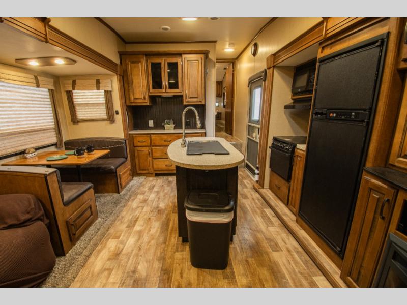 Back down on the main level find a kitchen area with counter top and overhead storage space along the interior living area wall. There is a convenient island with a double sink and counter prep space, plus a slide out to the left of the door including a three burner range, a refrigerator, and entertainment center with 32" TV plus fireplace. There is also an outside entertainment center along the exterior of this same slide out.