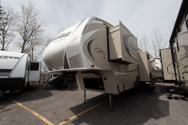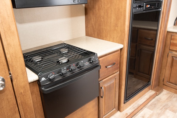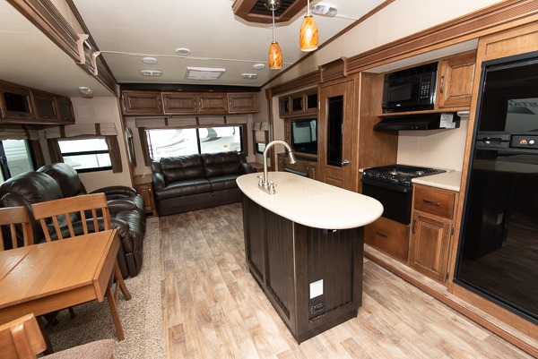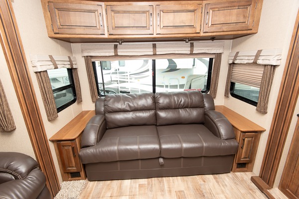 Tucked in the rear of the fifth wheel you will find a hide-a-bed sofa that is perfect for relaxing and also provides additional sleeping when needed (queen sized bed).