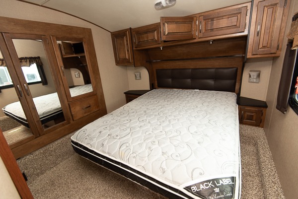 What I liked most: Sturdy aluminum steps feel reassuring and safe. The wood cabinets look great and provide lots of storage. The fireplace looks great right below the entertainment center. I really like the cabinet and nightstand on each side of the bed and the overhead shelf. Also, the leather rectangular piece on the headboard of the bed is a nice touch and makes this a more unique bedroom.