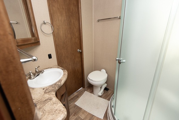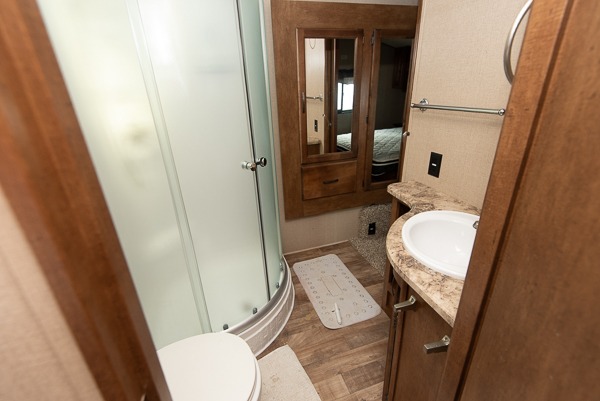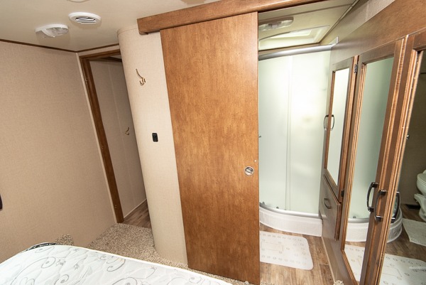 Back at the entry door you can step up to the right and find a front master suite with bathroom accessible from the hall door, or from within the bedroom. Enjoy a restful nights sleep in a comfortable queen bed including overhead storage cabinets and nightstands beside the bed. There is a slide out with wardrobes, and linen cabinet that falls within the bath when the sliding door is closed.