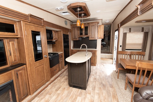 To your immediate left of the entrance you will see an optional dinette along with theater seating in a slide out. There is a center kitchen island which includes a double sink for easy food prep and cleanup. Directly opposite is a second larger slide featuring a refrigerator, a three burner range, and pantry for dry goods storage. This slide also features a entertainment center with 39" TV with overhead storage cabinets and fireplace. There is also a hutch with overhead storage straight in from the entrance to the right of the kitchen island.
