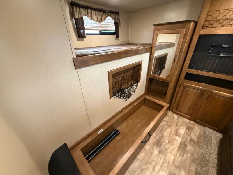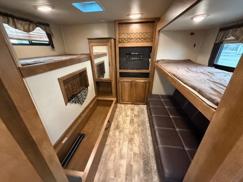 In the very rear of this Reflection unit find a private bunkhouse with slide out sofa bed and flip bunk above on the right. There is a smaller sofa bed opposite with a toy trunk beneath and 32" x 74" bunk bed above. Both sofa beds convert to a king size bed when put together. The bunkroom also features an entertainment center, and wardrobe, plus end table.