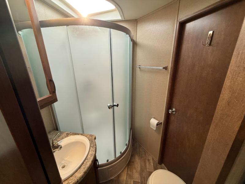 Head to the right in the main living space to find a side aisle bath with corner shower including skylight, sink with overhead cabinet, and toilet. There is also a second sliding door that leads into a front master bedroom.