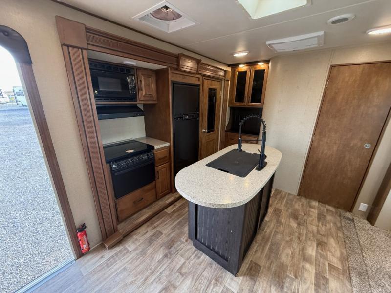 Enjoy the entertainment center with fireplace beneath a 32" TV along the exterior angled bathroom wall. There is also a center kitchen island with double sinks, plenty of counter space, and storage.