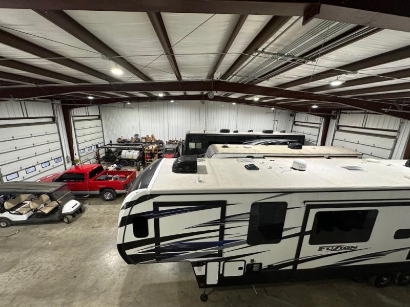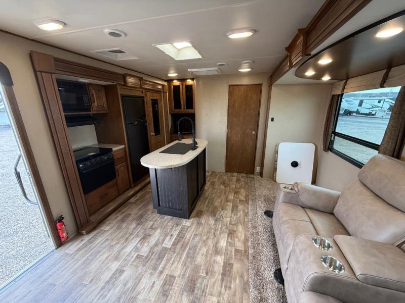A generous exterior pass-through storage compartment in the front makes it easy to store all of your outdoor camping gear. In the rear enjoy an outdoor kitchen which features a sink, overhead microwave overhead storage, a refrigerator, and two burner stove top, plus more.