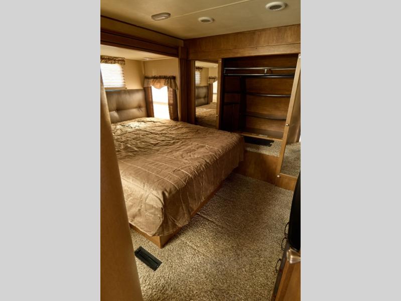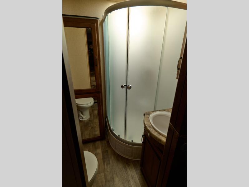 What I liked most: Wide open living area, lots of counter and kitchen storage... and I absolutely love the large sink in the island (makes washing large camping dishes much easier) I love to cook so the kitchen space was a big plus for me. Bathroom has much more storage for linens etc, than most RVs, and 'medicine' cabinet is super large, and having 3 mirrors is so convenient. Bedroom dresser and closet makes it so much easier camping - no living out of suitcase or bag. With this RV, i do not find myself constantly rotating stuff to make room to do things or get to things. There is a space for everything. Nothing beats sitting in the comfortable theater seats in front of the fire place, relaxing and watching some tv with the hubby.