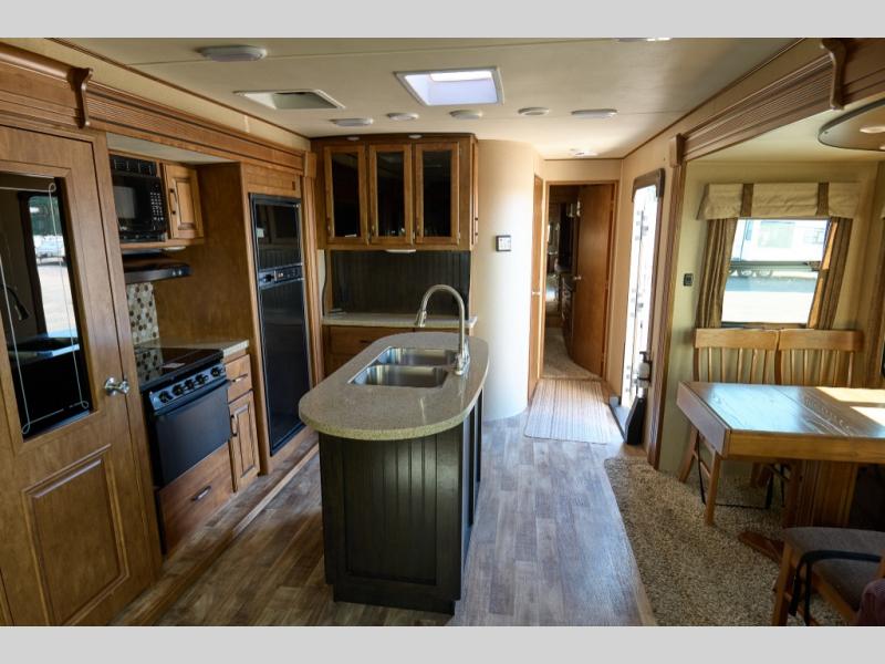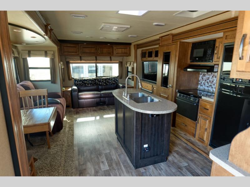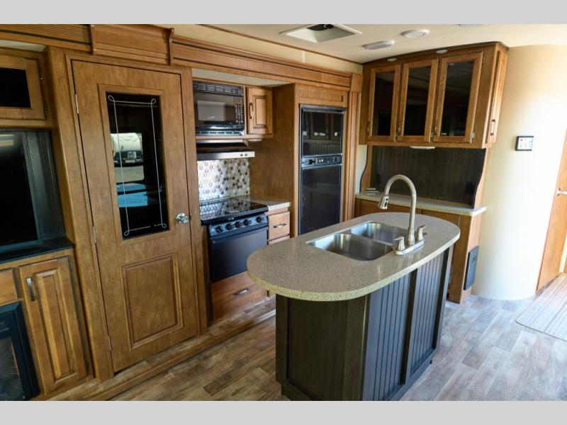 The slide opposite the door side features a 39" TV entertainment center with fireplace, a large pantry, three burner range, and refrigerator. An off center island is where you will find a double sink, more counter space, and a bit more storage. There is also a hutch with overhead cabinets along the interior wall, plus so much more!