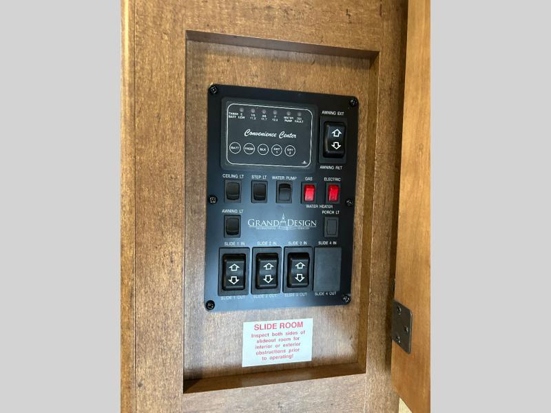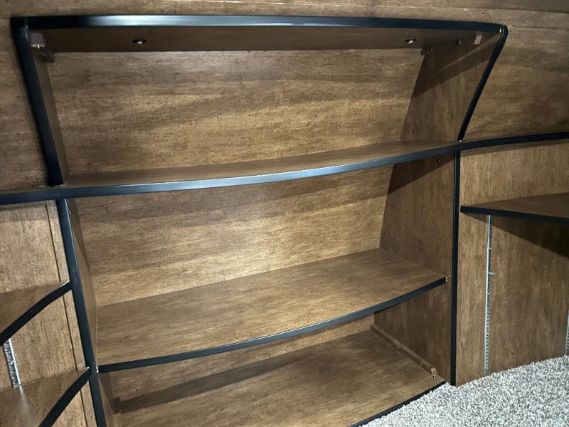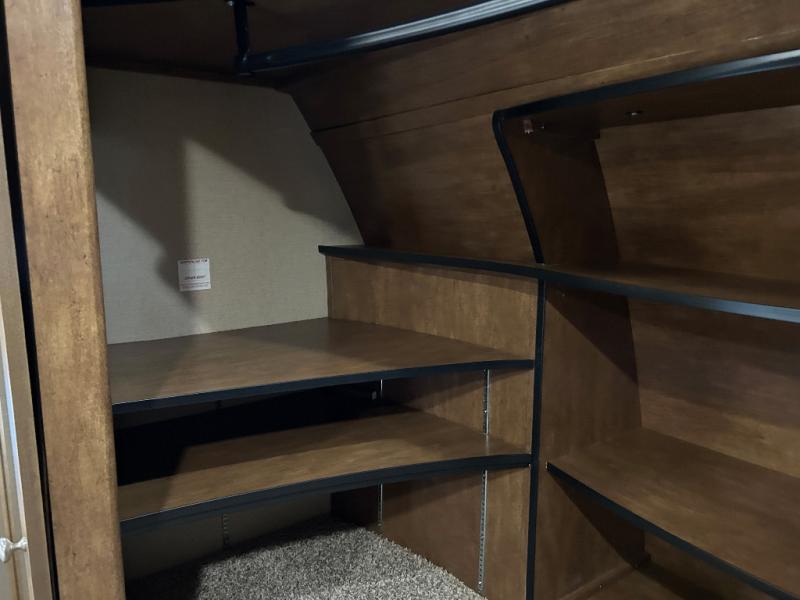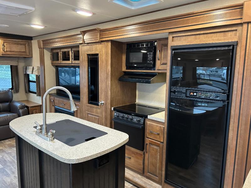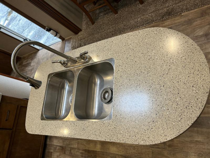 The slide opposite the door side features a 39" TV entertainment center with fireplace, a large pantry, three burner range, and refrigerator. An off center island is where you will find a double sink, more counter space, and a bit more storage. There is also a hutch with overhead cabinets along the interior wall, plus so much more!
