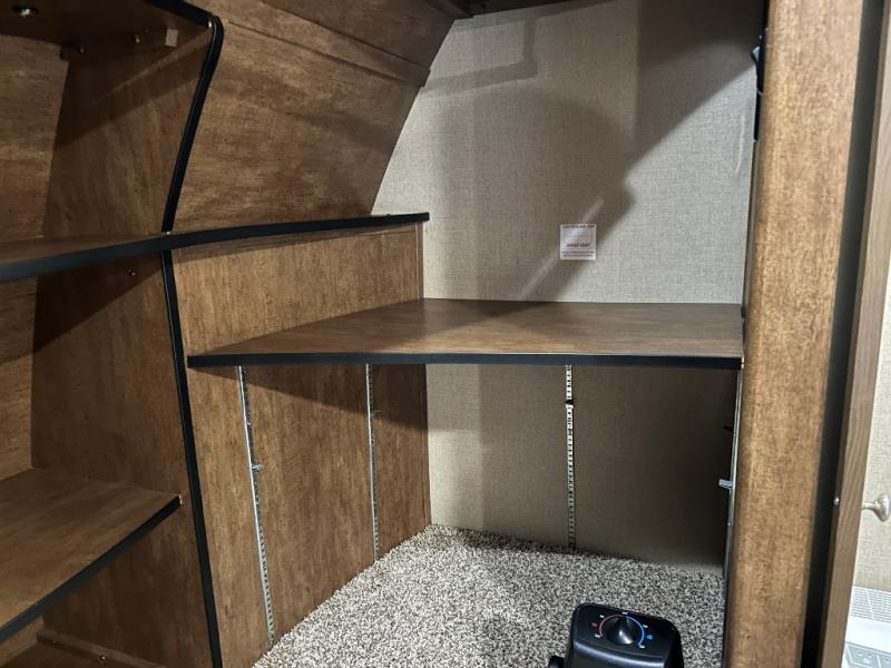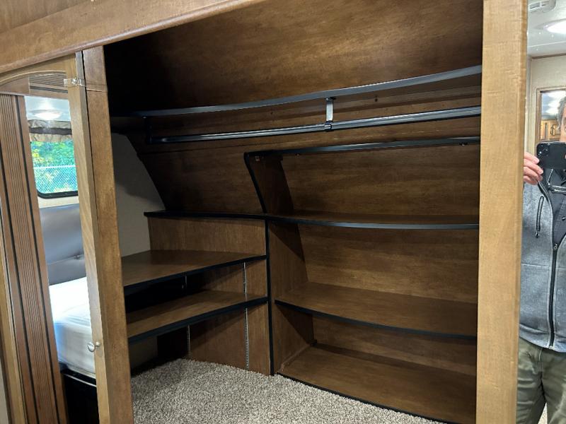 The master bedroom can also be accessed from a hall doorway. Inside find a queen bed slide, or choose the optional king. There is exterior storage at the head of the bed slide. Opposite along the curb side wall find a dresser with storage above, and a space prepped for TV if you wish to add. The front wall features a wardrobe with pass-through access and washer/dryer prep.