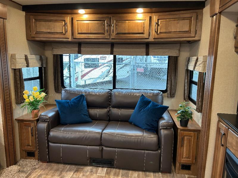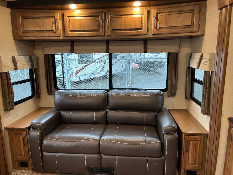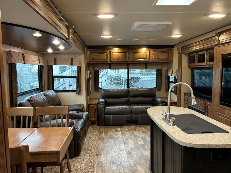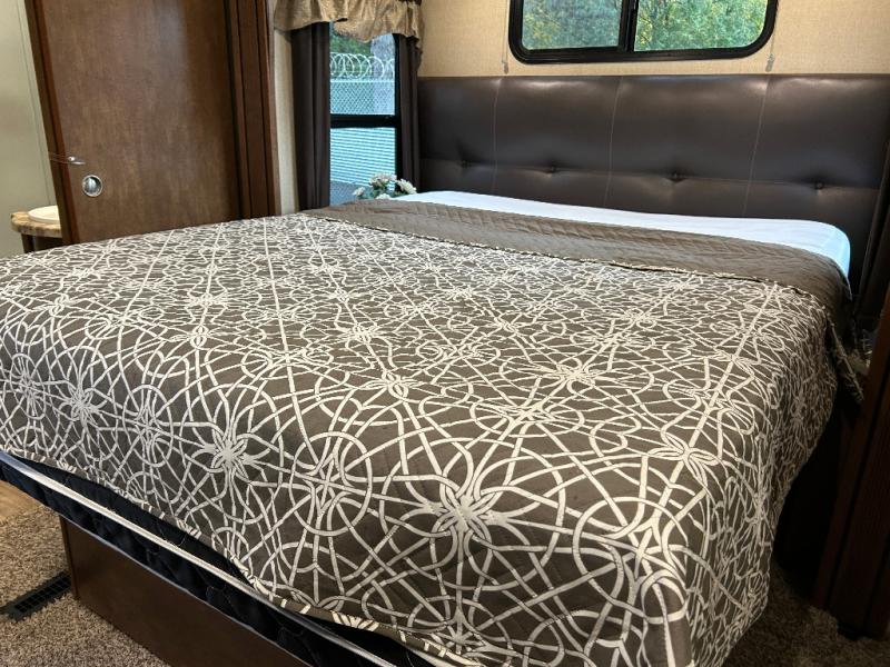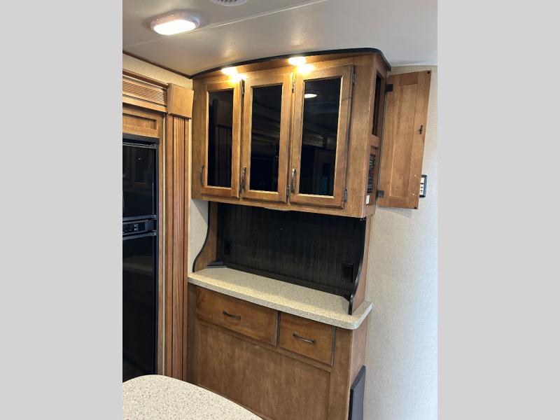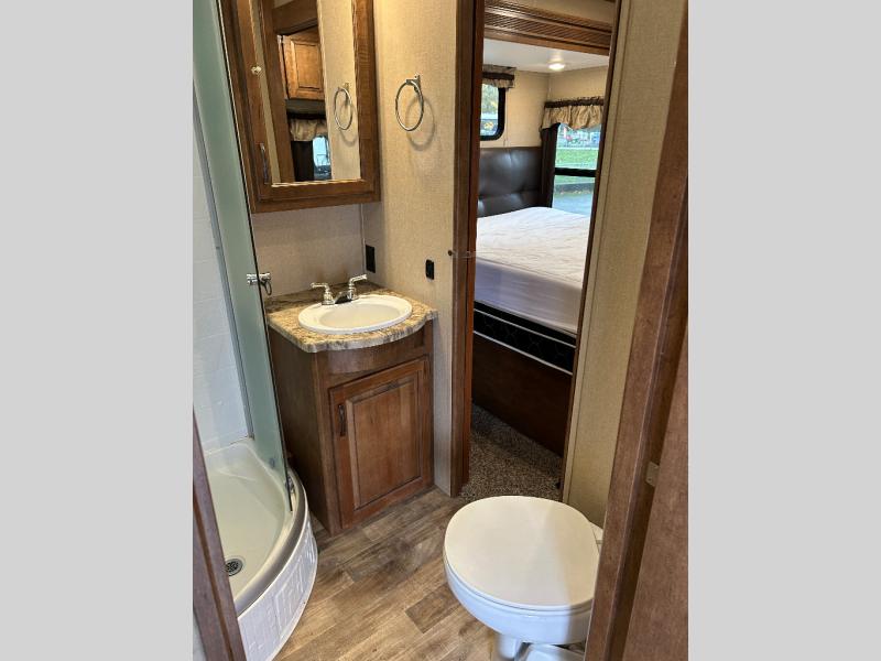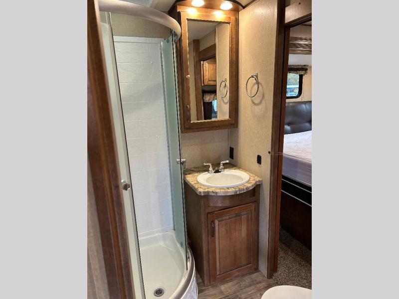 What I liked most: Wide open living area, lots of counter and kitchen storage... and I absolutely love the large sink in the island (makes washing large camping dishes much easier) I love to cook so the kitchen space was a big plus for me. Bathroom has much more storage for linens etc, than most RVs, and 'medicine' cabinet is super large, and having 3 mirrors is so convenient. Bedroom dresser and closet makes it so much easier camping - no living out of suitcase or bag. With this RV, i do not find myself constantly rotating stuff to make room to do things or get to things. There is a space for everything. Nothing beats sitting in the comfortable theater seats in front of the fire place, relaxing and watching some tv with the hubby.