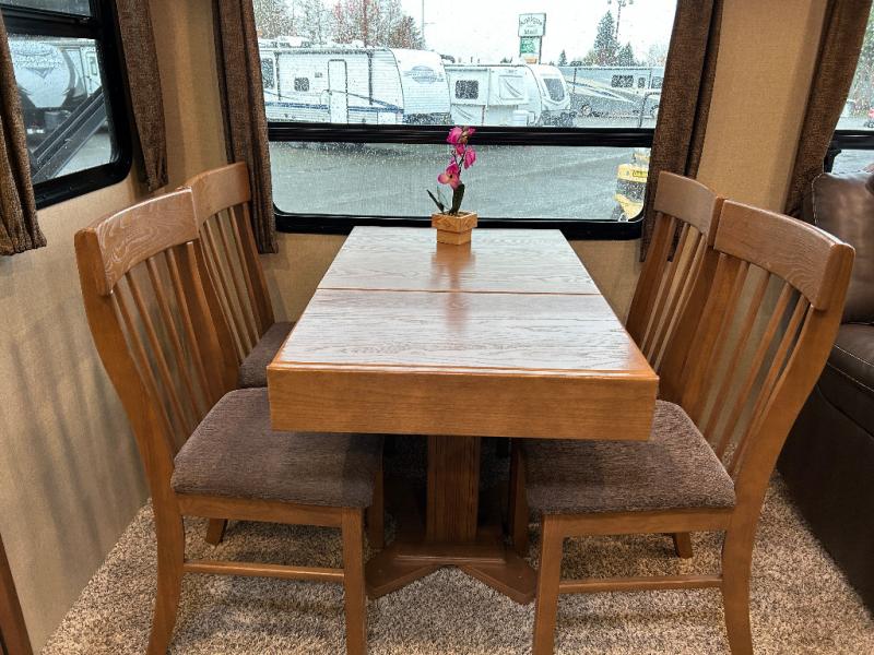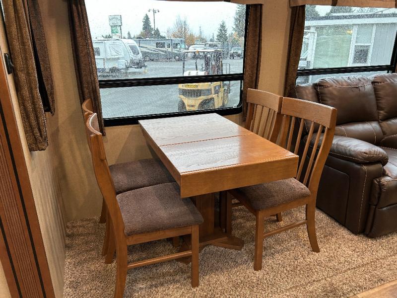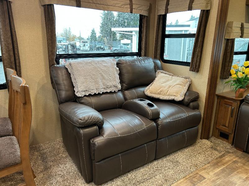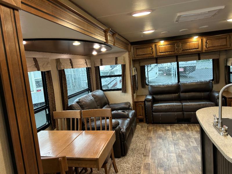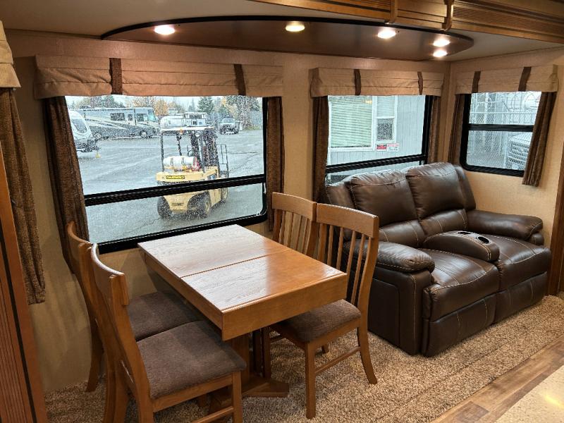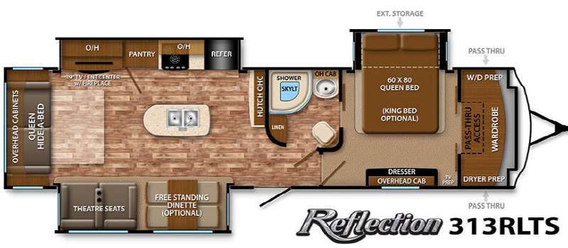 To the left as you enter Reflection 313RLTS you will see a spacious combined kitchen and living room with dual opposing slides. There is a booth dinette and theater seats slide out on the door side providing seating and dining conveniences with the option of choosing a free standing dinette.