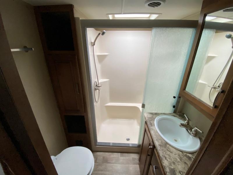 You will love the dual opposing slides in the main living area of this unit which creates a wide open feel with plenty of walking around space. Just to the left of the entry door notice the booth dinette or optional free standing dinette shown, plus theater seating with storage above and cup holders for two. A hutch with overhead storage is located straight in from the main entry door. The slide on the opposite side of the room features a 8 cu. ft. refrigerator, a food pantry, and three burner range with overhead storage. This slide also features a 39" TV entertainment center with fireplace below.