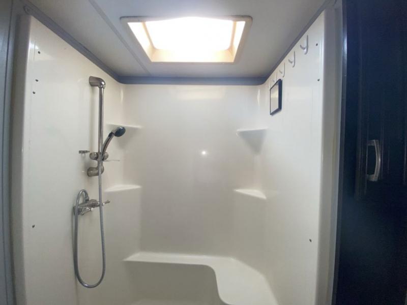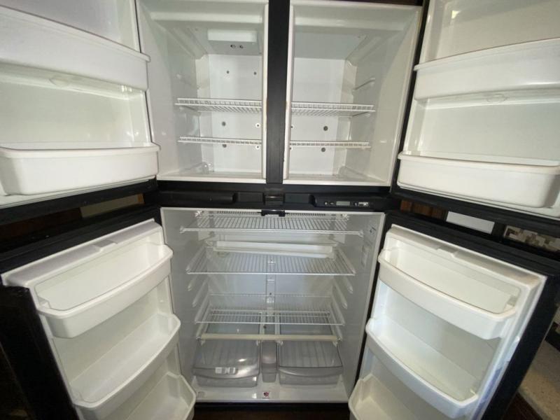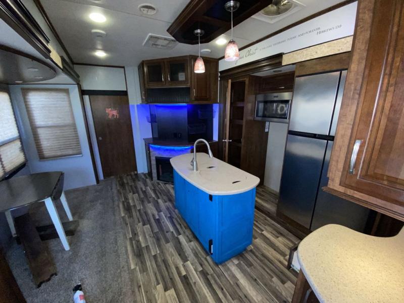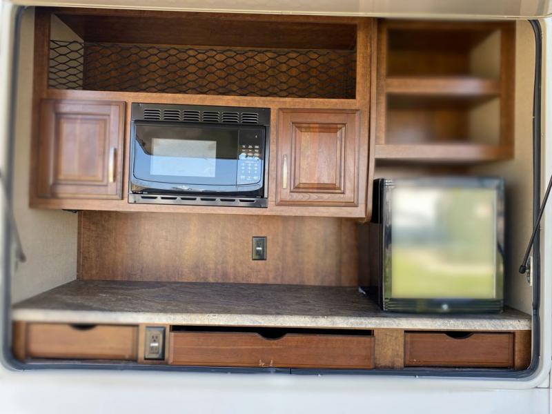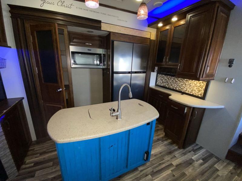 The kitchen provides a slide out pantry, three burner range with overhead microwave, and an 18 cu. ft refrigerator slide out opposite the door. There is also a hutch for storage with cabinets above. The island features a double sink and added counter space for meal prep and more.