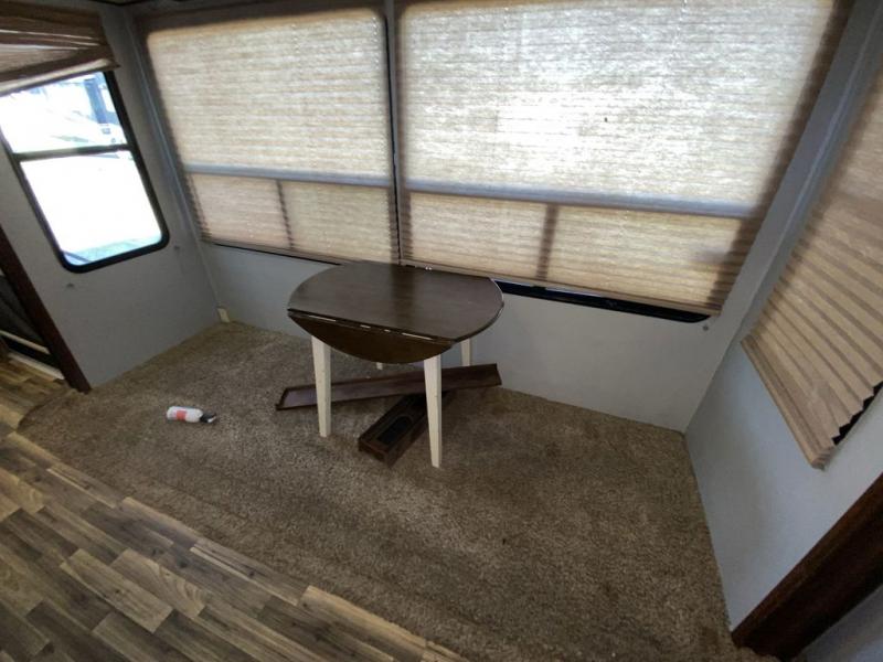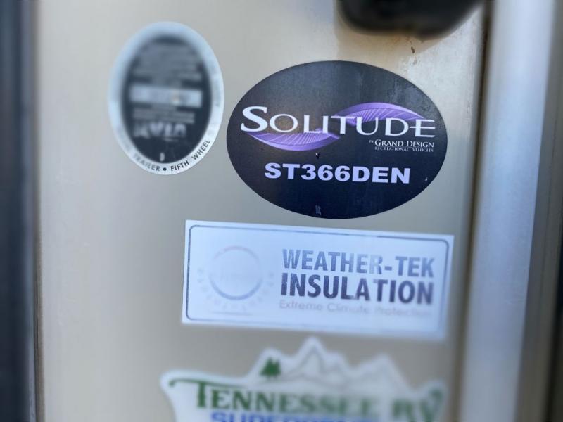 This rear entertainment Solitude fifth wheel model 366DEN by Grand Design is almost identical to model 365DEN. The main difference is that in place of the curb side hide-a-bed slide in the rear is instead an entertainment center with bunk above on the inside, and it also has an outdoor kitchen beneath the bunk as well. This unit has everything you and your guests will need to enjoy any future camping trip you take.