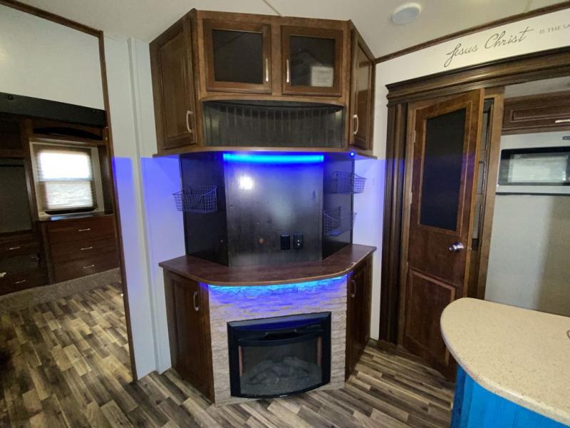 Step inside and enjoy a spacious kitchen and living area combined. There are dual opposing slides with the first to your immediate left featuring a free standing dinette with four chairs and heated theater seats with cup holders. Along the angled wall opposite the theater seats enjoy a fireplace with LED TV above on a swivel arm for viewing easily depending on where you are in the space.