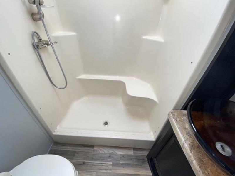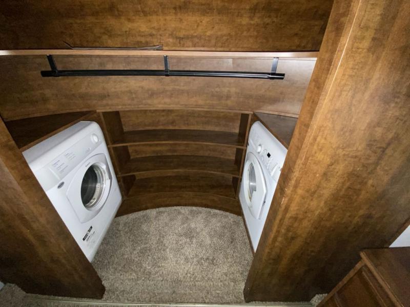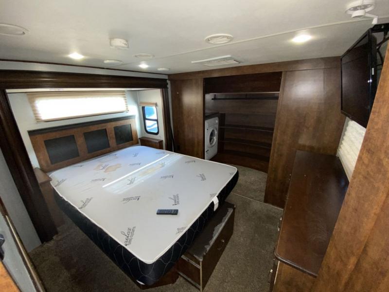 Inside the front master bedroom you will find a slide out queen or optional king bed, a pull out ottoman off the foot of the bed, a dresser along the curb side wall with optional LED TV above, and a full front closet with shirt storage plus washer and dryer prep.