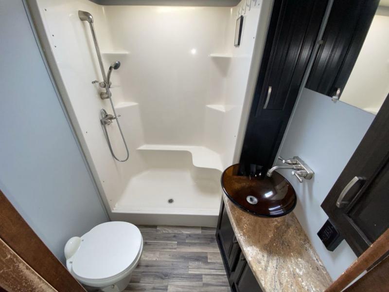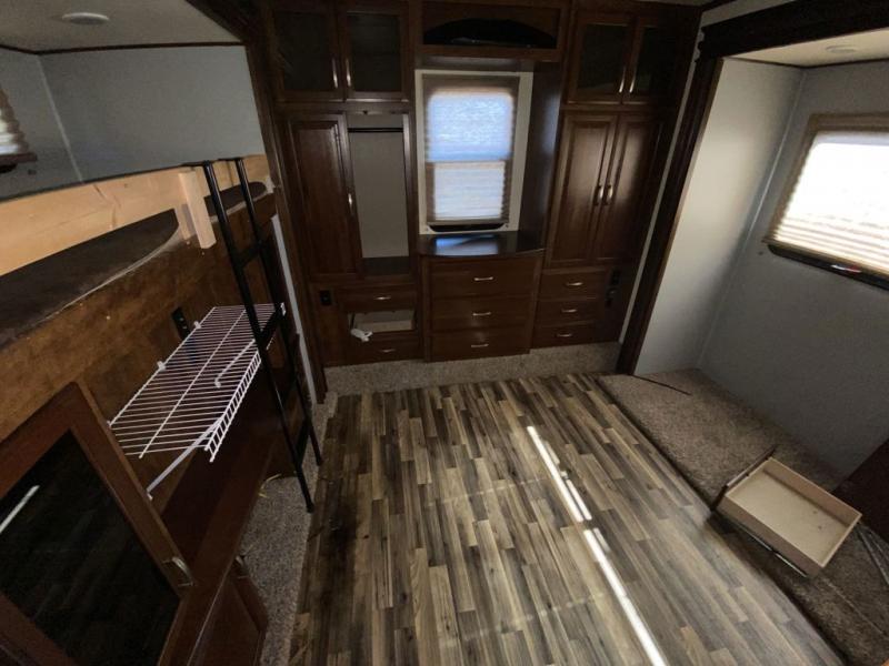 Back through to the very rear of this Solitude 366DEN you will find a private rear living area bunk room with full wall entertainment center. There is a fireplace in the center flanked by two closets on either side. There are dual opposing slide outs for seating and sleeping. The entertainment center in the slide to your left features a 32" x 74" bunk above. The slide opposite features a hide-a-bed sofa with seating and sleeping accommodations at night. You will also enjoy a convenient half bath off this room which features a toilet and sink.