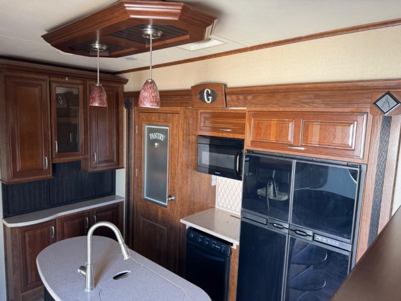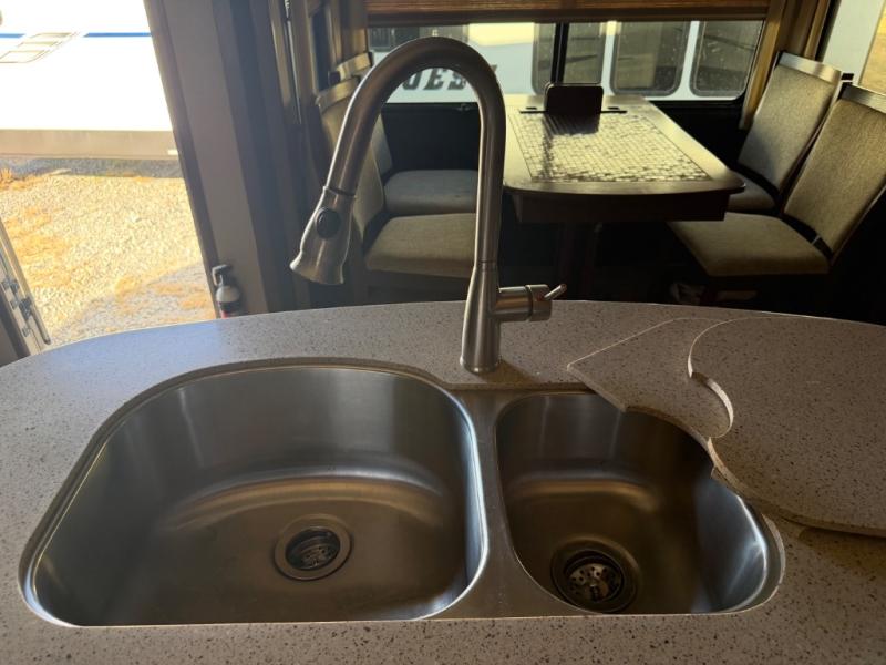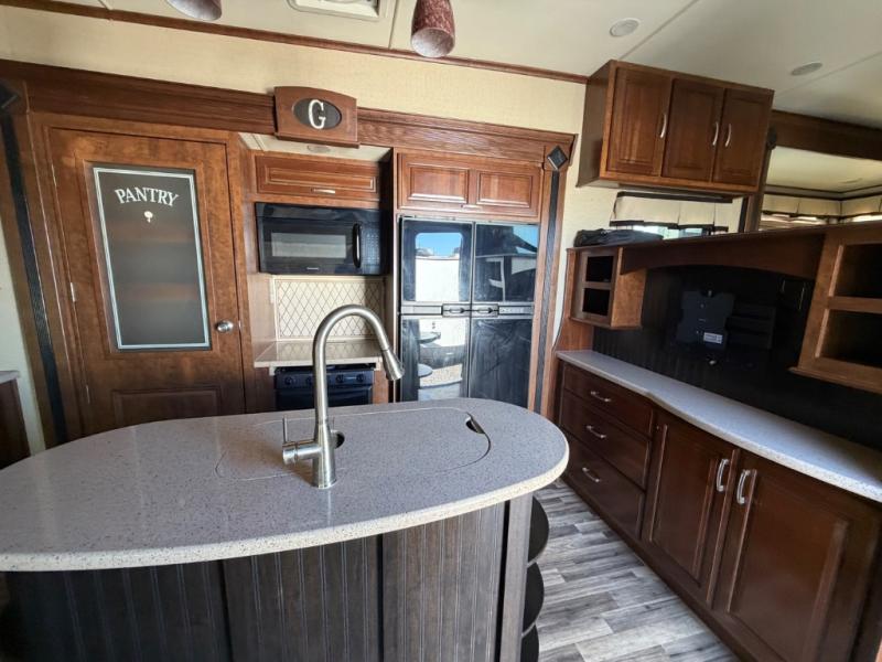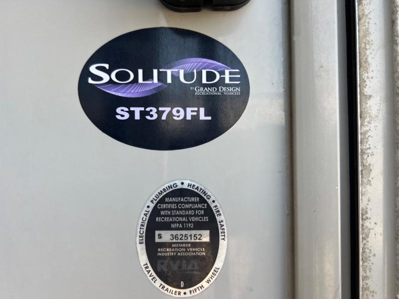 This Solitude fifth wheel 379FL by Grand Design features a super front living space perfect for entertaining, a rear bedroom with private entry, and FIVE slides for added interior space. This unit seems to have it all. Traveling will feel as though you took your whole house with you! Step inside the entry door closest to the front. As you enter you are in a spacious kitchen featuring dual opposing slides. To your left is a slide out dinette table and chairs. There is a center island with double sinks including counter space. You will find even more counter space on either side of the room along the interior walls with overhead cabinets and base cabinet storage also. The slide opposite the dinette features a large pantry, a three burner range with overhead microwave oven, and a 18 cu. ft. refrigerator. The front living area also features dual slides with two 80" tri-fold sofas. There is a 58" theater sofa to the left as you enter the living space and a 50" LED HDTV at the front of the room with fireplace below. The perfect space for entertaining guests and enjoying a conversation with family and friends. Back through the kitchen continue on down the hall to a side aisle bath on your right. The bath features a toilet, vanity with vessel sink, linen cabinet, and large shower with seat. The rear private bedroom with its own entry door features a standard queen size bed slide out, or you may choose an optional king. There is a pull-out ottoman at the foot of the bed, and an LED HDTV on the opposite wall. Along the rear wall of the bedroom you will find a double closet with drawers on one side, and a space prepped for a washer and dryer if you choose to add stackable units. There is plenty of storage, and space for everyone in this Solitude 379FL with a raised front living room!