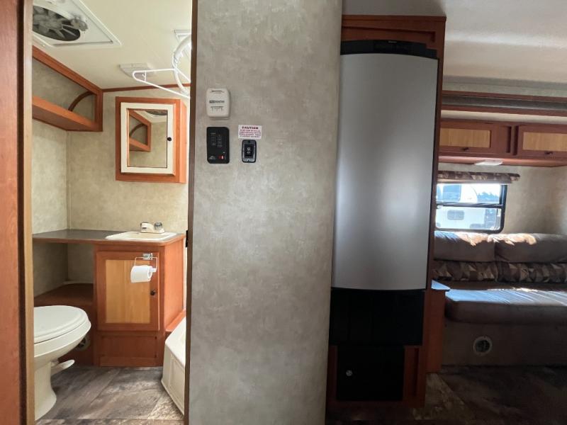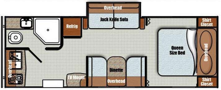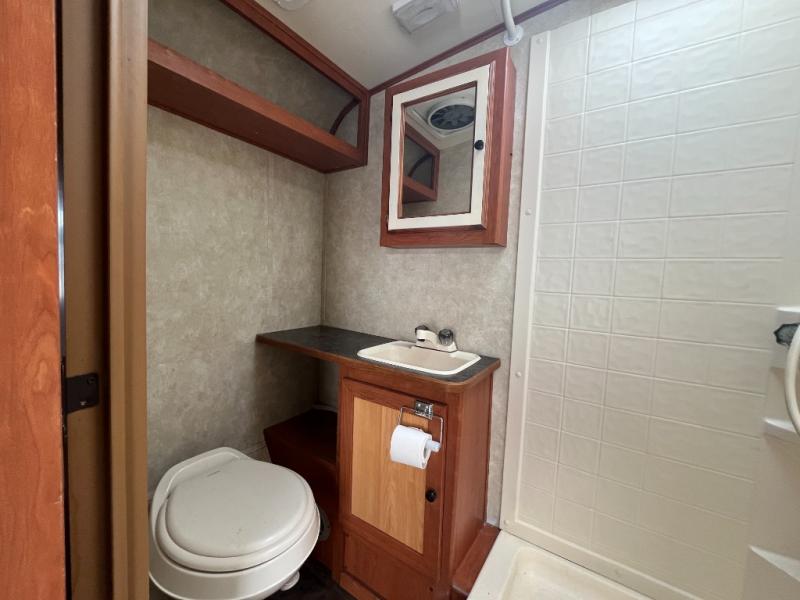 Straight ahead is a complete bath featuring an angled shower, toilet, and vanity with sink. The refrigerator is just around the corner of the bath before the jackknife sofa slide out.