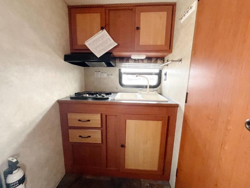 Enter and find a two burner cook-top, and double kitchen sink tucked in the rear corner to the left of the door. There is overhead storage for your dishes and things as well.