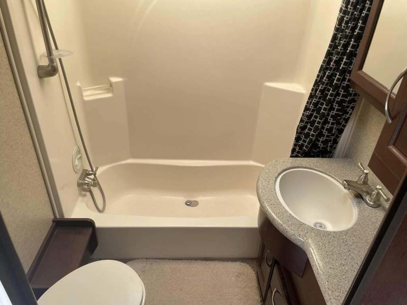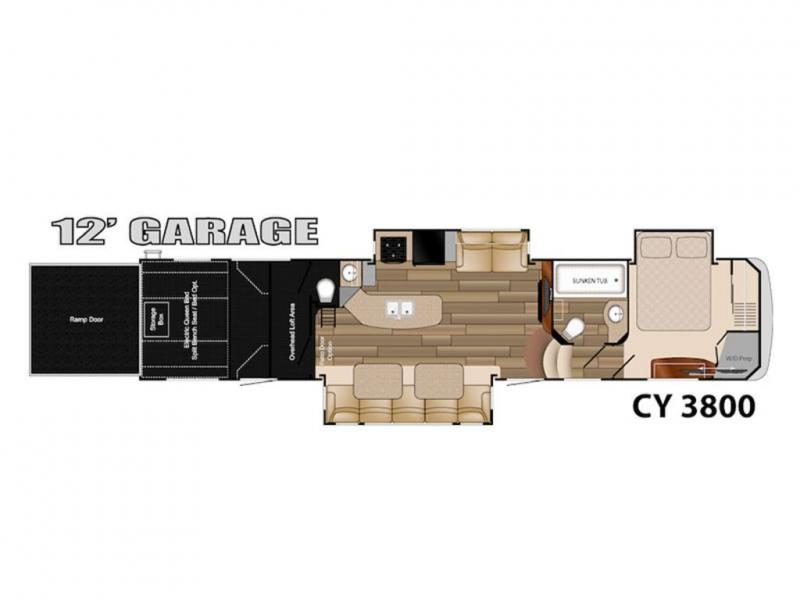 The rear 8' ramp door makes loading and unloading a snap. Inside the garage space there is a storage box built in the floor for tools or things you might need. There are also two corner overhead storage cabinets for outdoor gear. Plus, you will love the convenience of a half bath featuring a toilet and sink.