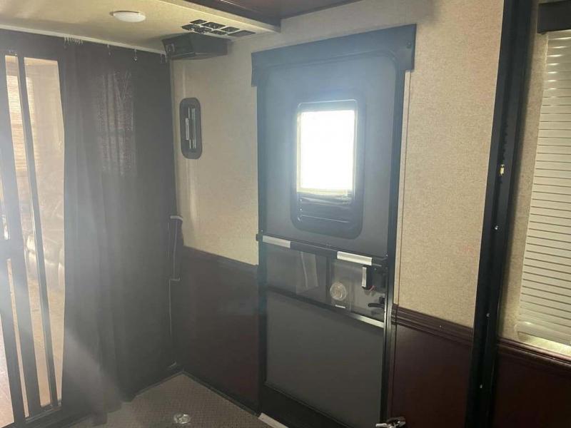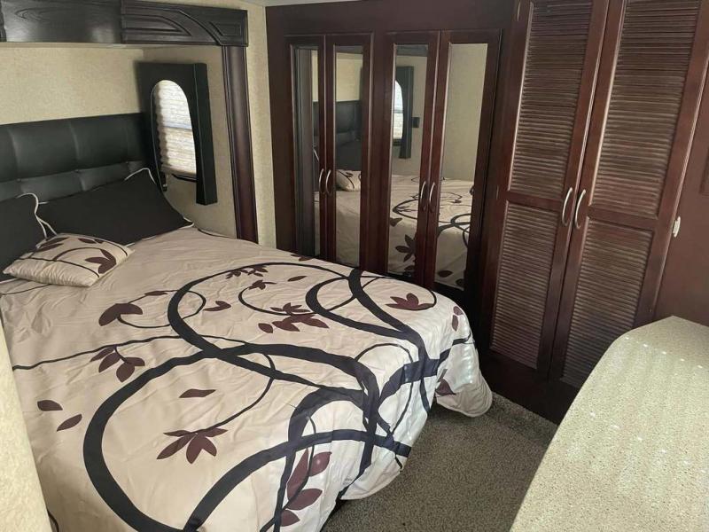 The private front bedroom offers a quiet relaxing retreat with a slide out queen bed, dresser, slide out TV, and front wall wardrobe with sliding doors, and a corner closet with washer/dryer prep, plus so much more!
