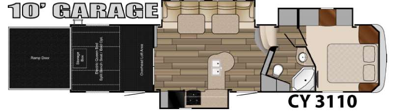 Back through to the garage space find an overhead loft that overlooks the main room. Head through the glass patio doors to a 10' garage featuring a storage box and side man door. The rear ramp door will make loading and unloading a cinch. And, if you need more space add the electric queen bed split bench seat/bed for added sleeping and seating space. Another option might be a garage TV for viewing.