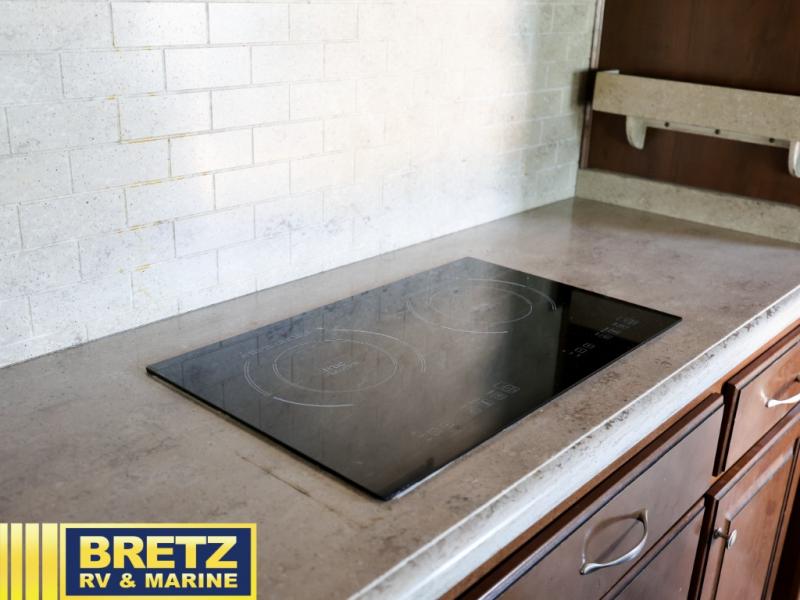 Next to the entertainment center in the slide opposite find lots of counter space, a two burner cook-top, and double door refrigerator with freezer drawer beneath. There is a counter area with large sink making prep work and cleaning up easy.