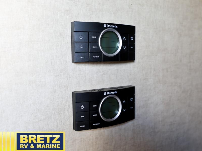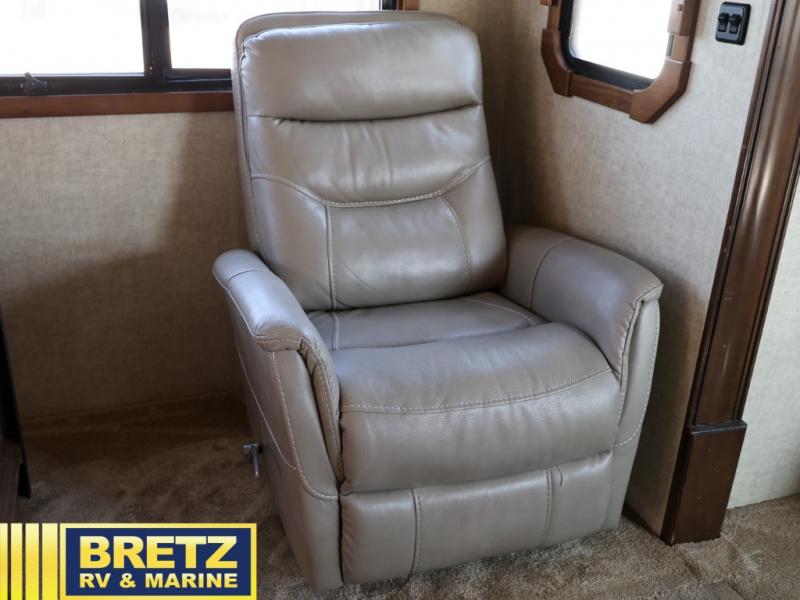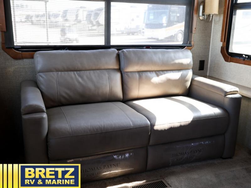 To the left of the entry door find a dinette for two, along with two recliners for relaxing and enjoying the entertainment center in the slide opposite. There is also a sofa with storage above including end tables that stretch across the rear of this coach.